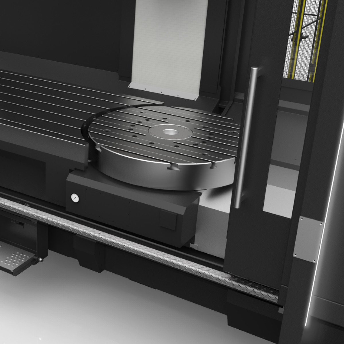 - Гнучкість: поєднання поворотного столу і прямокутного столу, розташованих на одній осі лінійного руху і на однаковій висоті, дозволяє обробляти деталі на повному столі або на кожному окремо.